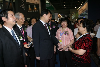 在博览会期间江苏省省长罗志军(左三)、江苏省副省长史和平(左一)、中国纺织工业协会会长杜钰洲(左二)参观亚萍漂亮家纺展厅并与陆亚萍董事长亲切交谈(右图)