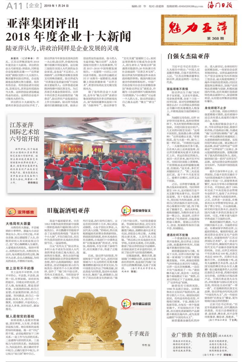 评出的另9大新闻为:不要再在参加会议时玩手机了,陆亚萍谈今年参加全国两会的一大心得;陆亚萍,价值两分钱餐巾纸撕开用反复用,这位刚三届连任全国人大代表的女企业家说,这也是“不忘初心,方得始终”;亚萍集团荣膺全国香文化特殊贡献奖,陆亚萍成为“沉香鉴定及质量分级”行业标准主要起草人;亚萍香道巡展欧洲传播中国沉香文化,为江苏省艺术基金资助项目;亚萍千件沉香艺术品惊艳首届“海香会”,陆亚萍在产业发展论坛上作主旨演讲;陆亚萍当选南通市妇联兼职副主席,她表示创业的女性最美丽,奋斗的人生最幸福;“魅力亚萍”入选全国报刊经营十大经典案例,写进2017-2018中国传媒发展报告;一天要用一小时以上时间读书看报,陆亚萍出趟差买回17本图书一星期看完;南通籍上将陆炳德参观“亚萍艺术”,希望尽快将此文化瑰宝发扬光大。